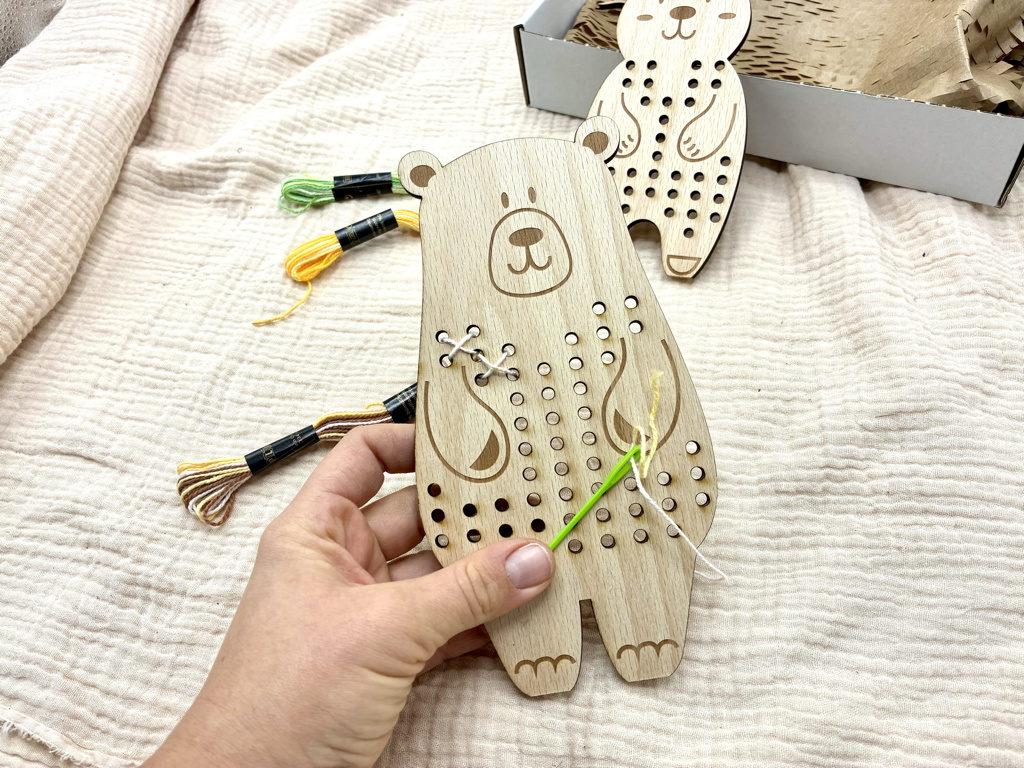 Výřezy jsou z kvalitní dubové překližky o tloušťce 4 mm, takže něco vydrží. Jednotlivé otvory pro bavlnku mají průměr 4mm.