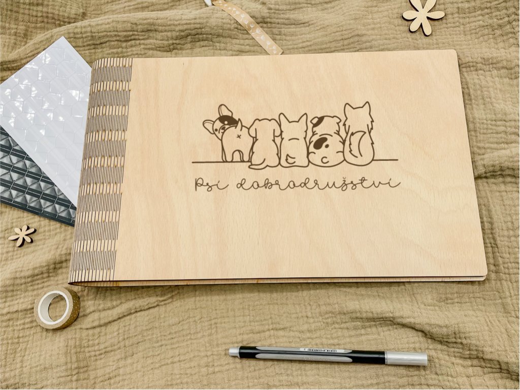 Originální fotoalbum můžeme doplnit vašim nápisem na míru. Na albu může být nápis "Psí dobrodružství" nebo třeba jméno vašeho pejska.
