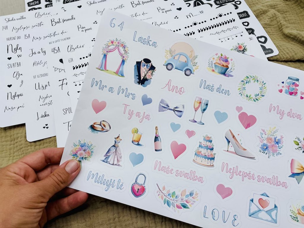 Velká sada svatebních samolepek do knihy hostů na svatbu