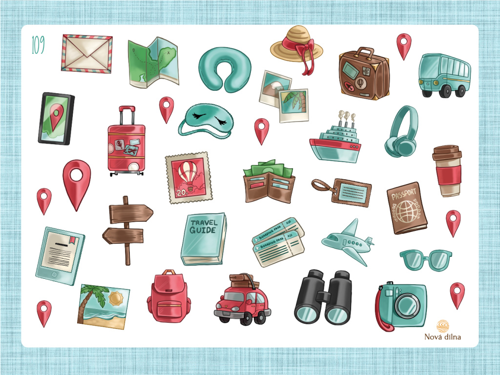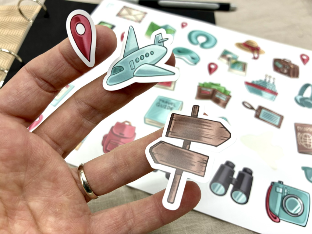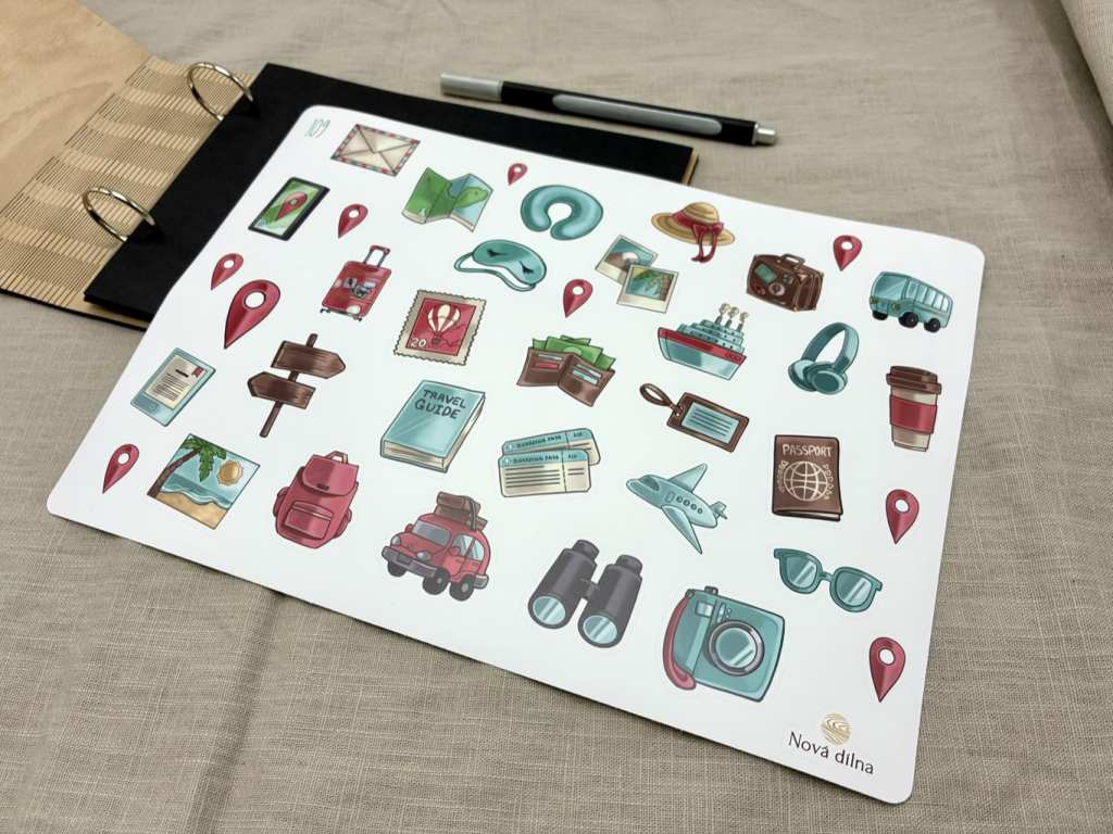 Na samolepkách najdete různé obrázky s cestovatelskými motivy jako třeba letadlo, kufr, nebo pas.