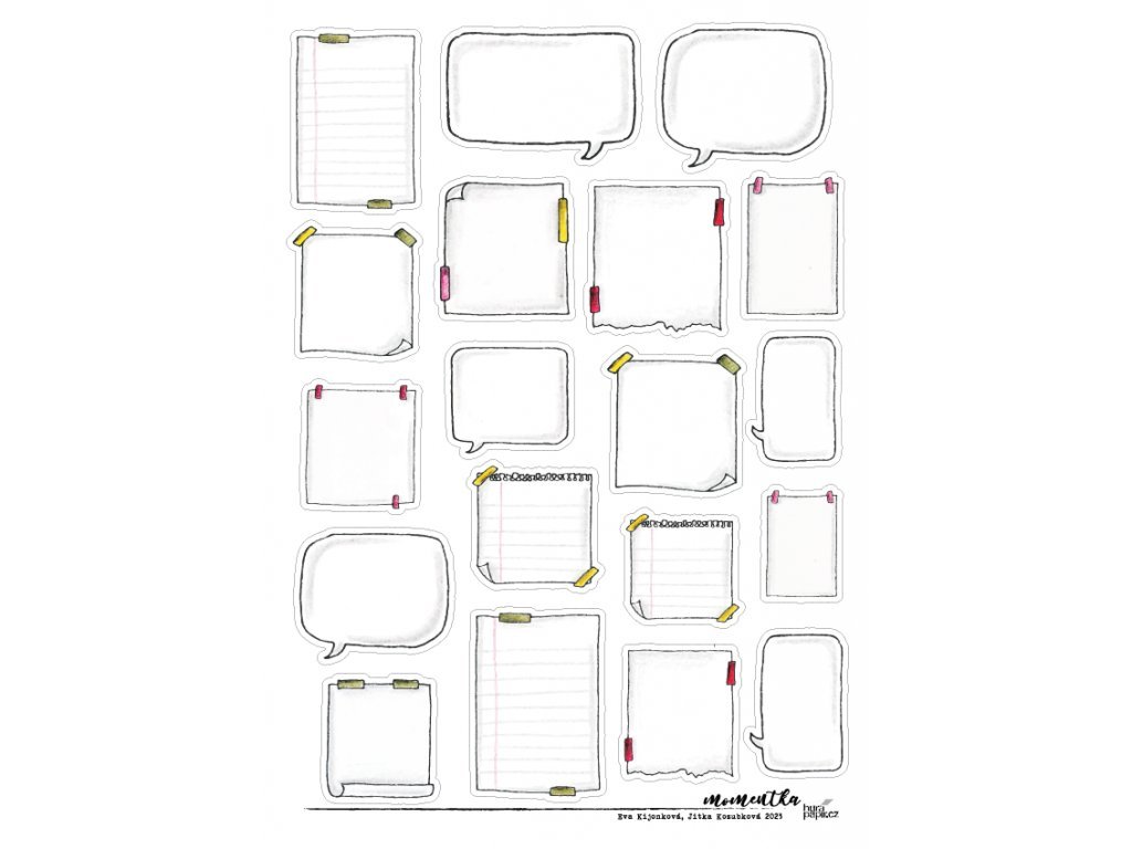 Samolepky jsou natištěny na bílém samolepícím archu. Jednotlivé obrázky a nápisy jsou předvyseknuté a můžete s nimi snadno dozdobit Vaše fotoalba.