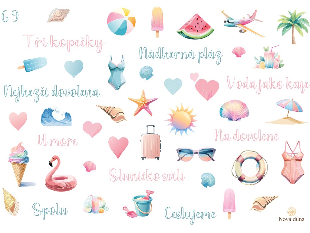 Soubor ve formátu PDF obsahuje celkem 44 obrázků (a nápisů) s motivy z dovolené u moře. Obrázky jsou na průhledném pozadí, není tedy problém je vytisknout na barevný papír nebo jiný povrch.