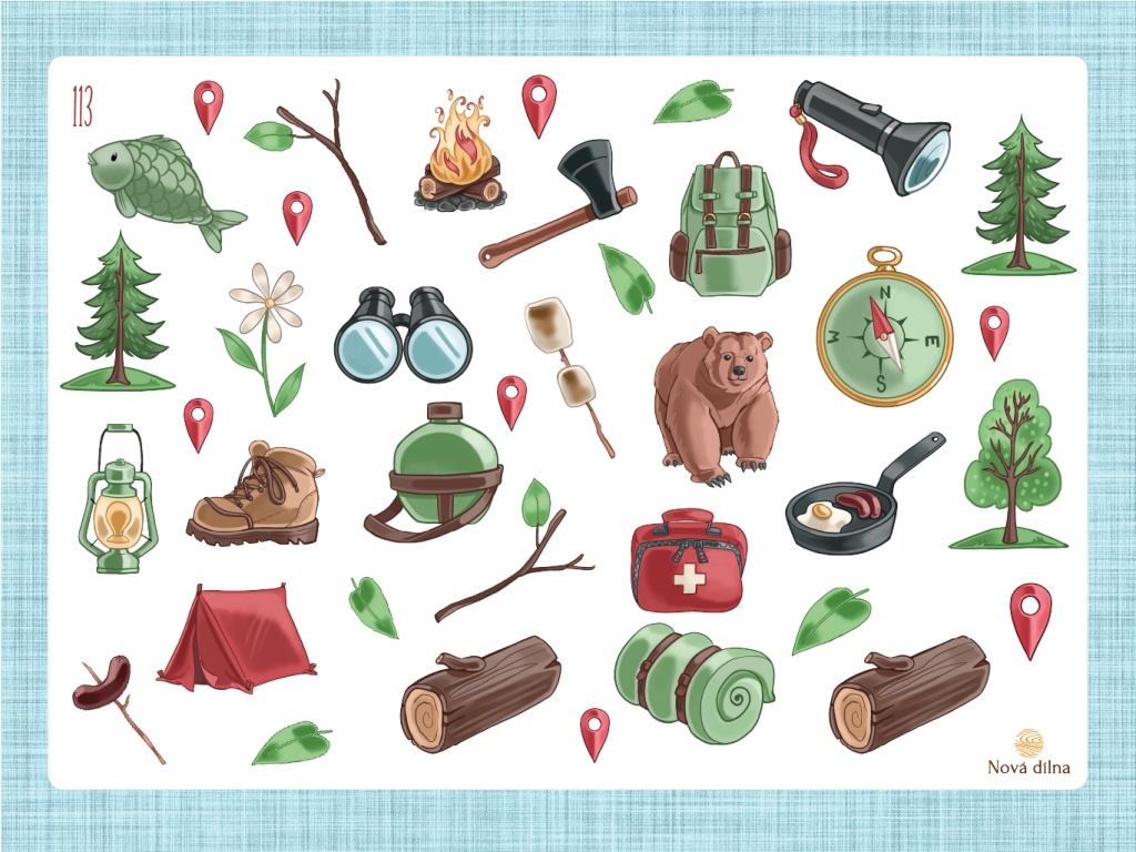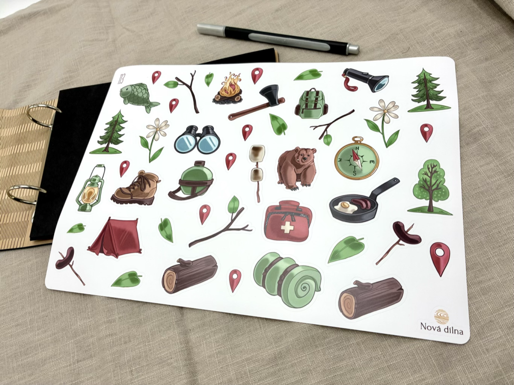 Na samolepkách najdete různé obrázky s motivy kempování, využijete k dozobaní fotoalba z dovolené.