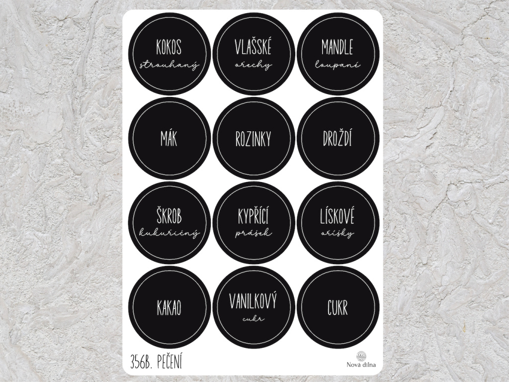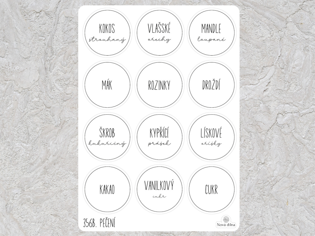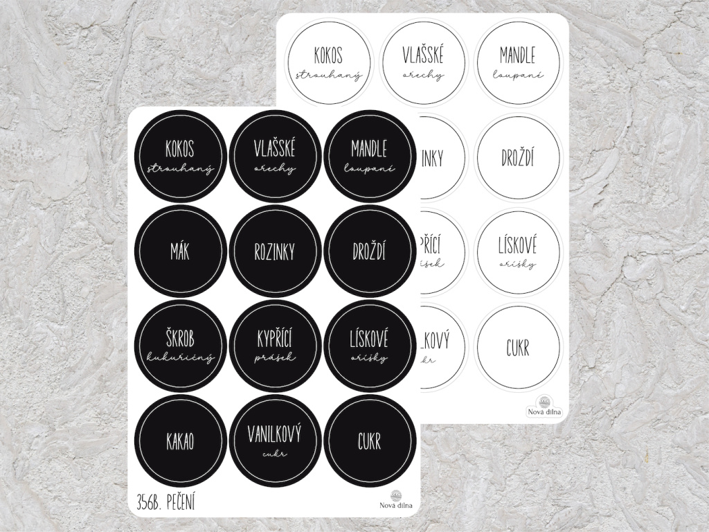 Tyto samolepky využijete pro organizaci oříšků a dalších přísad na pečení. Na archu naleznete všechny varianty, které budete potřebovat. Přesypte přísady do skleniček a dóz a vyhněte se nevzhledným pytlíčkům.