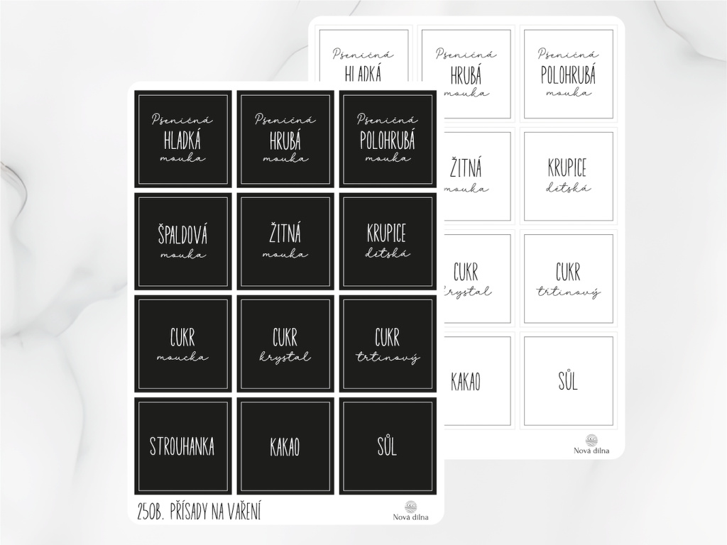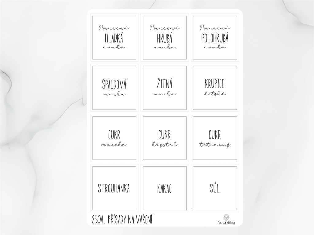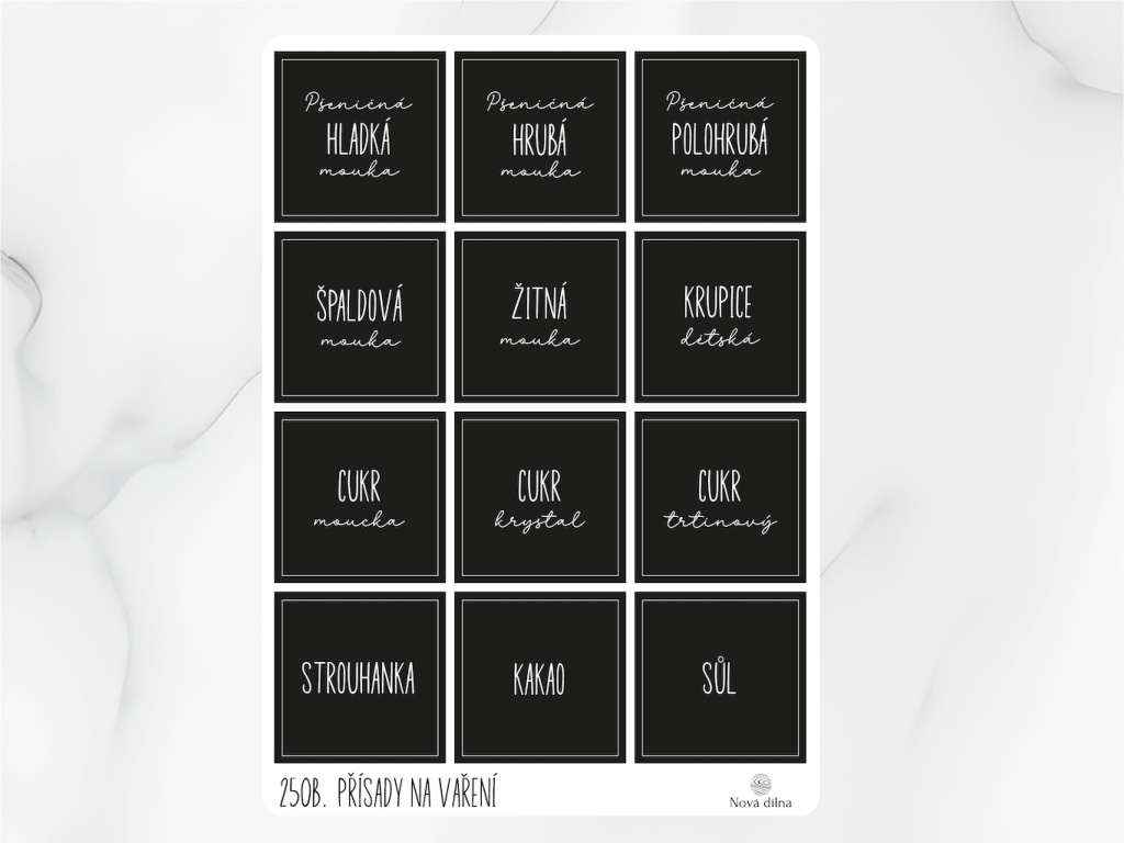 Minimalistické samolepky do kuchyně pro organizaci potravin. Nalepte štítky na jednotlivé krabičky. Díky elegantním samolepkám budete mít o potravinách přehled a kuchyně bude vypadat perfektně vyladěně,