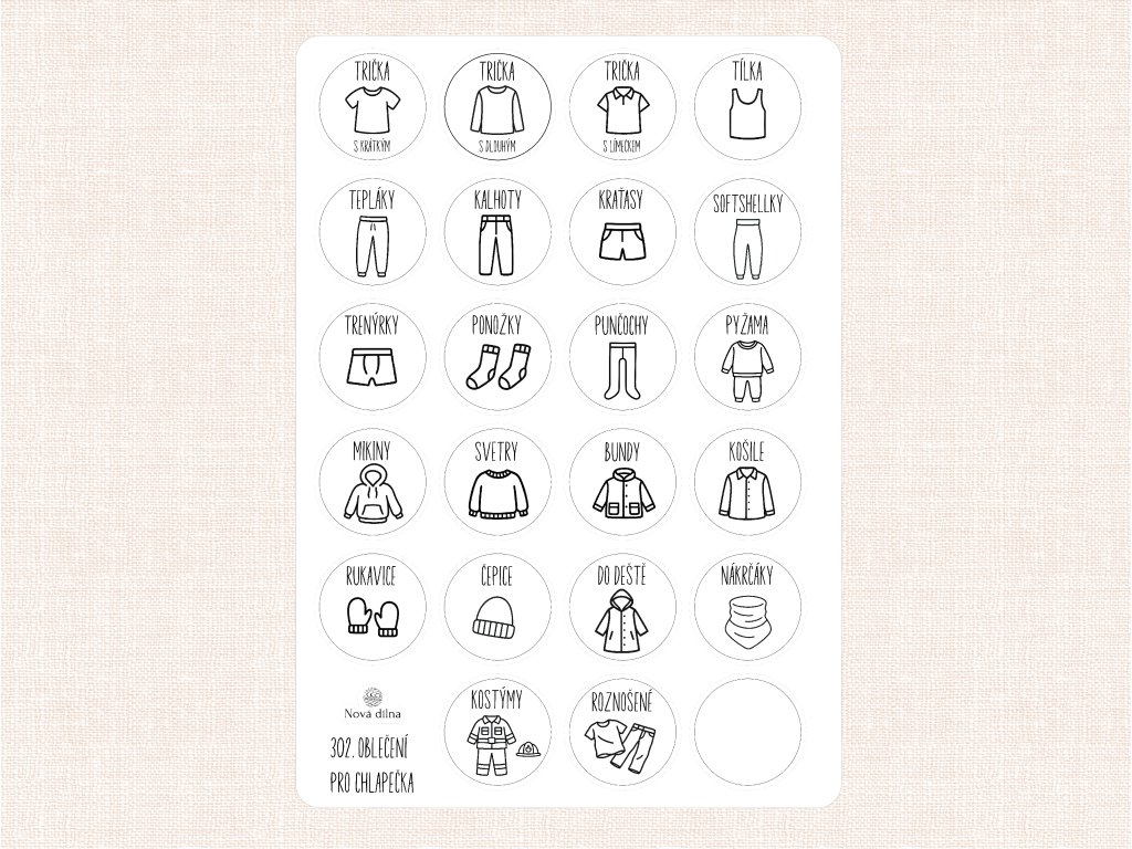 V sadě najdete jednotlivé ikony a čitelné nápisy raného druhu oblečení a také čtyři prázdné samolepky, kam můžete fixem dopsat něco, co Vám v sadě chybí.