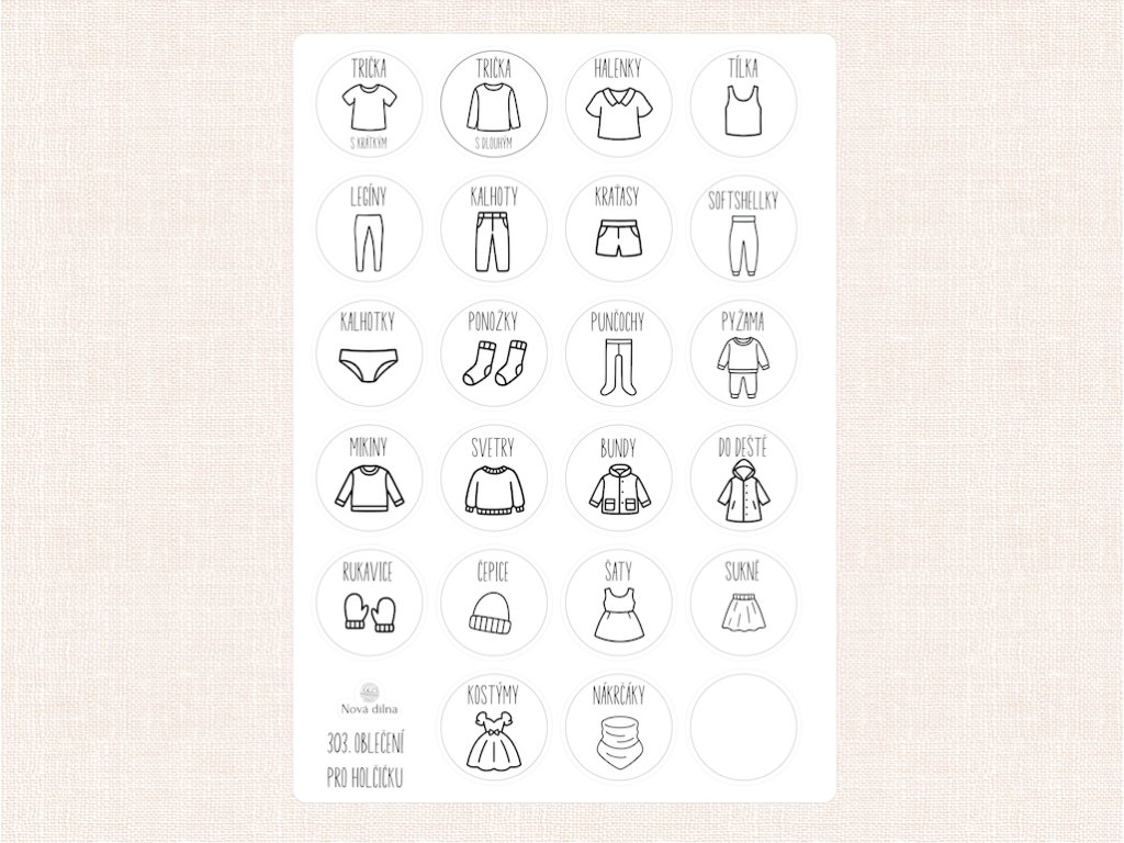 V sadě najdete jednotlivé ikony a čitelné nápisy raného druhu oblečení a také jednu prázdnou samolepku, kam můžete fixem dopsat něco, co Vám v sadě chybí.
