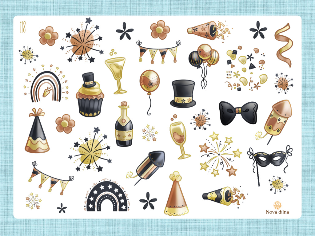 Na samolepkách najdete různé obrázky s motivy jako ohňostroj, masky a šampaňské.