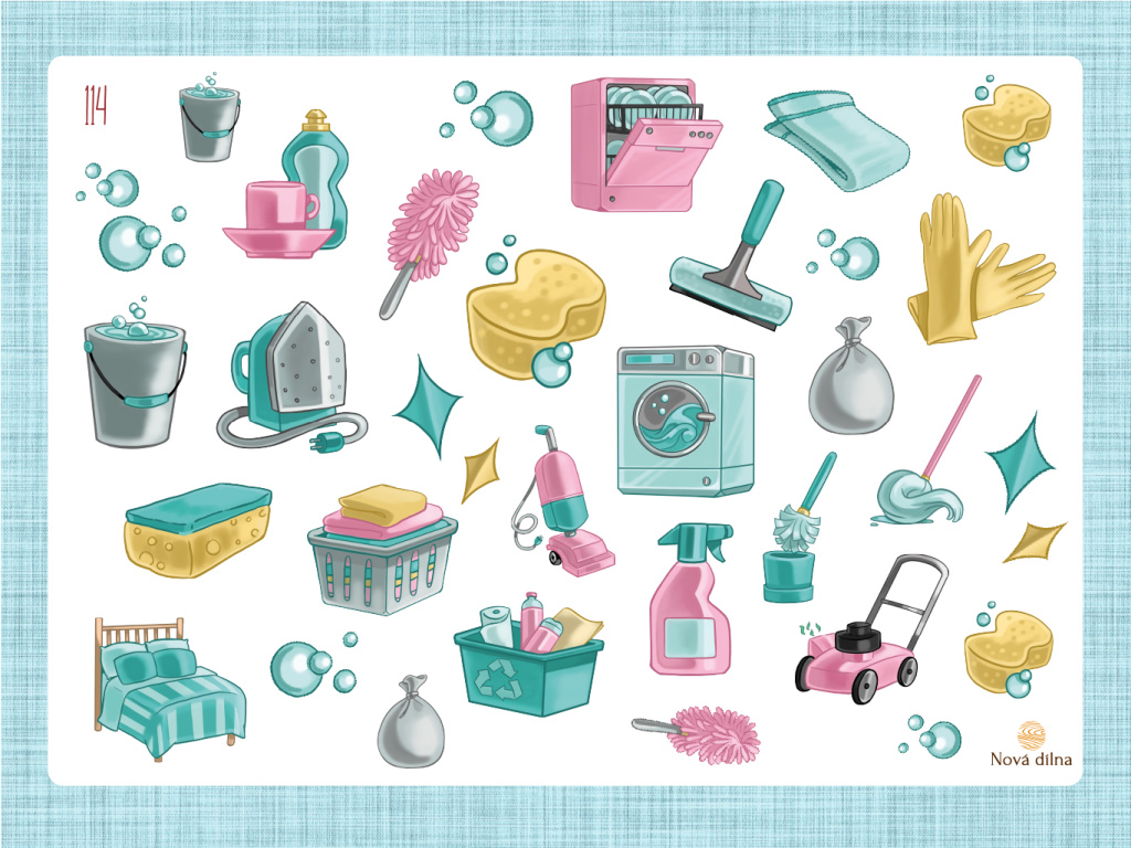 Na samolepkách najdete různé obrázky s motivy úklidu, můžete si tak naplánovat sklízecí dny ve svém diáři či plánovači stylově.