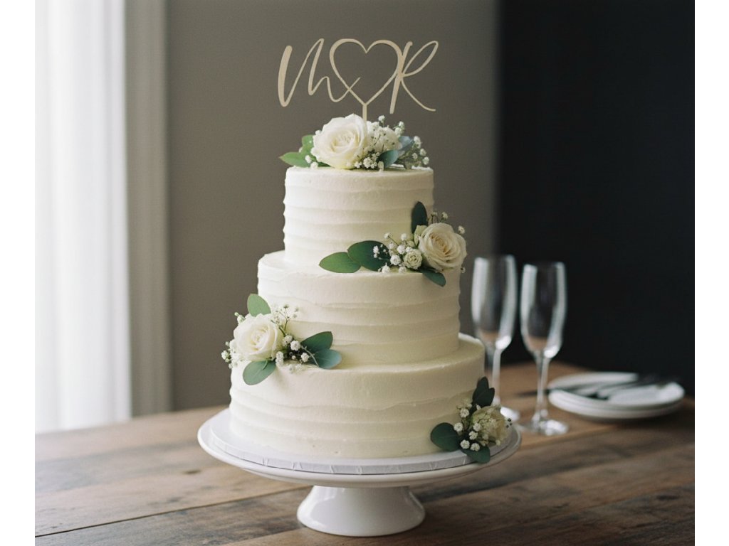 Dřevěný zápich do svatebního dortu s počátečními písmeny a srdcem