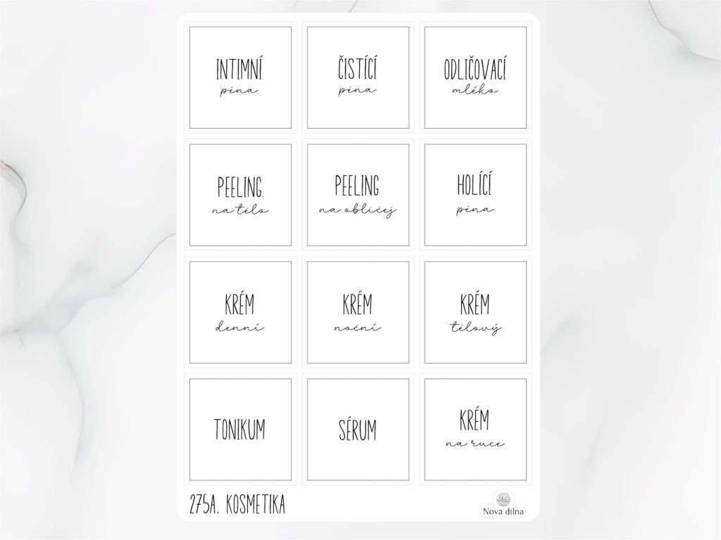 Vyberte si ze sady etikety, které potřebujete a nalepte je na lahvičku. Nalepení je velice snadné. Poté přelijte svou oblíbenou kosmetiku.